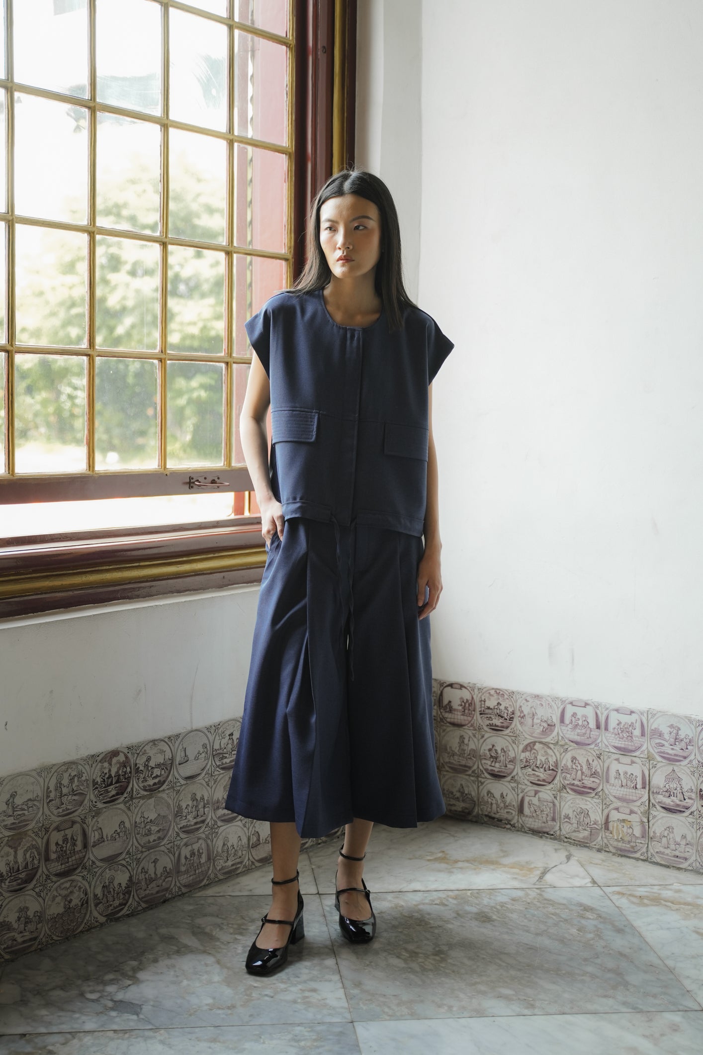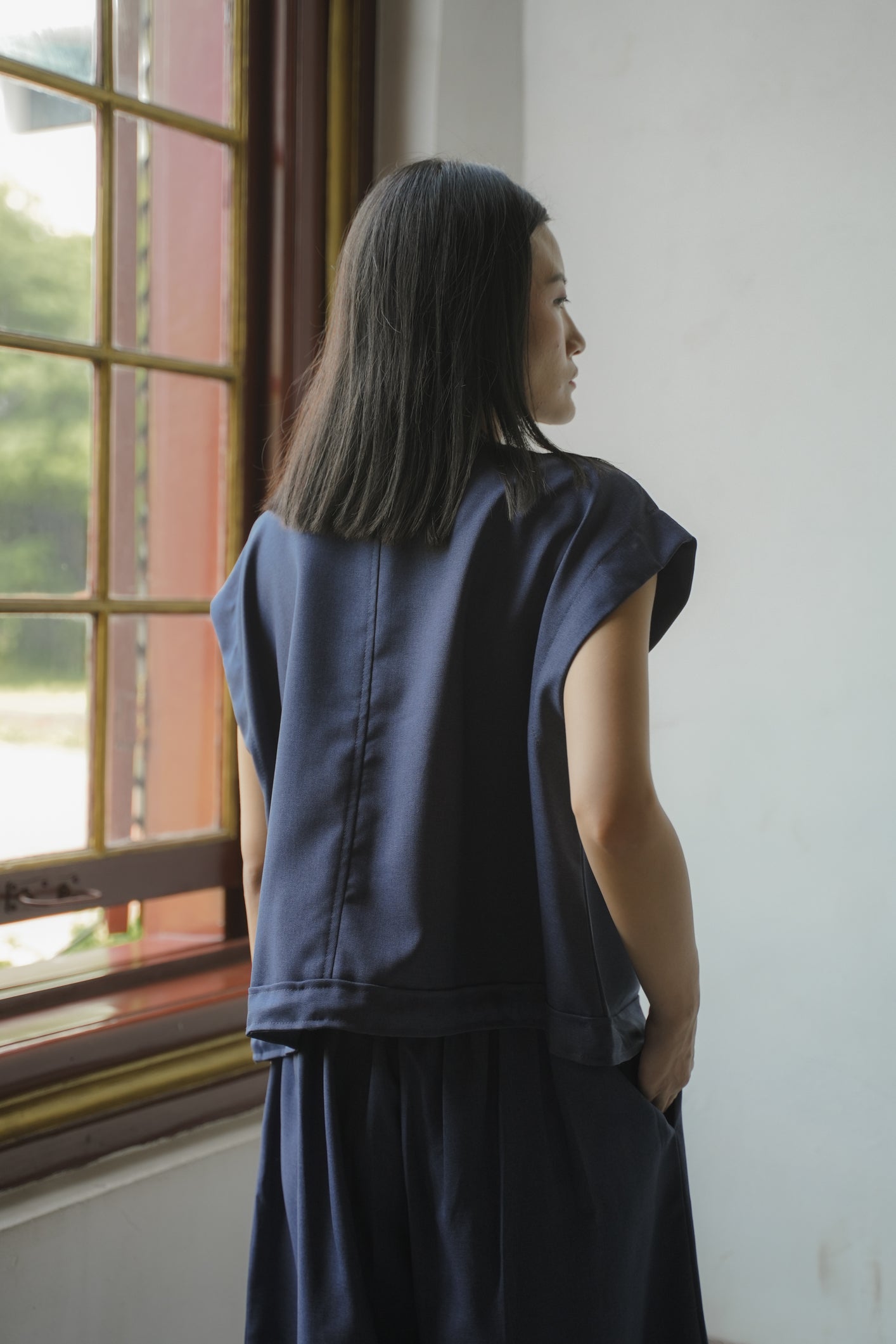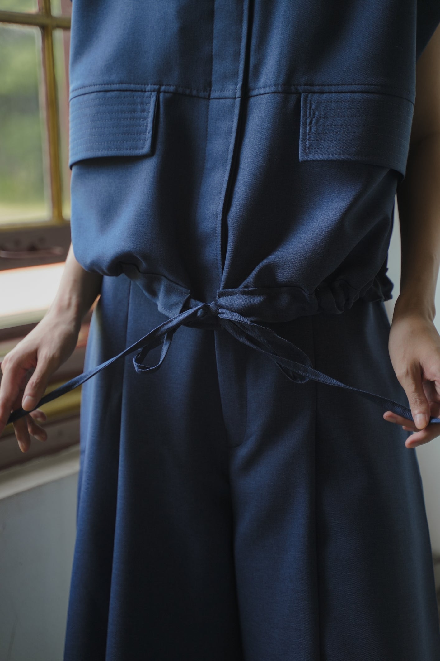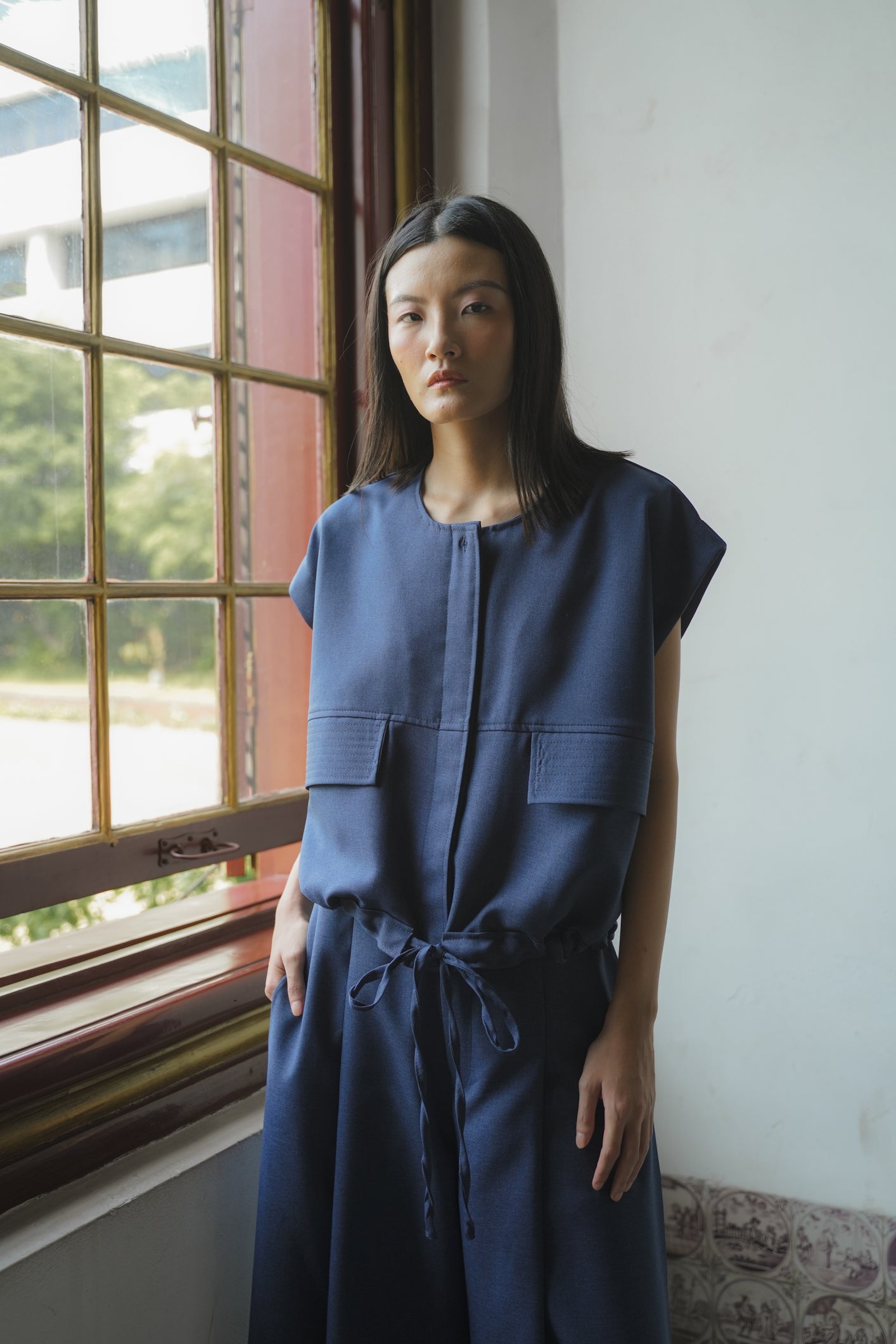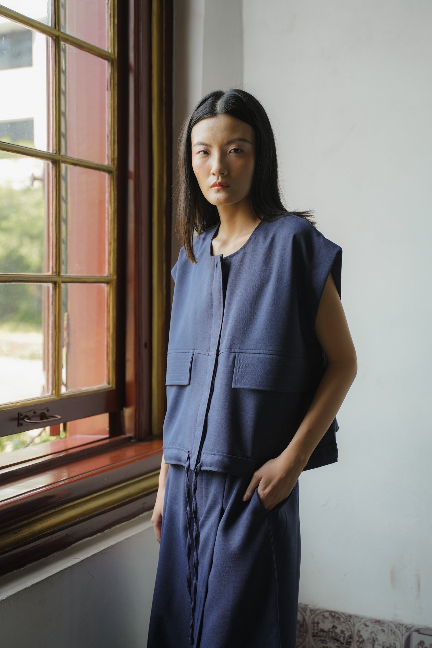 - Sleeveless vest with adjustable waist tie, two pockets on the front and real button.